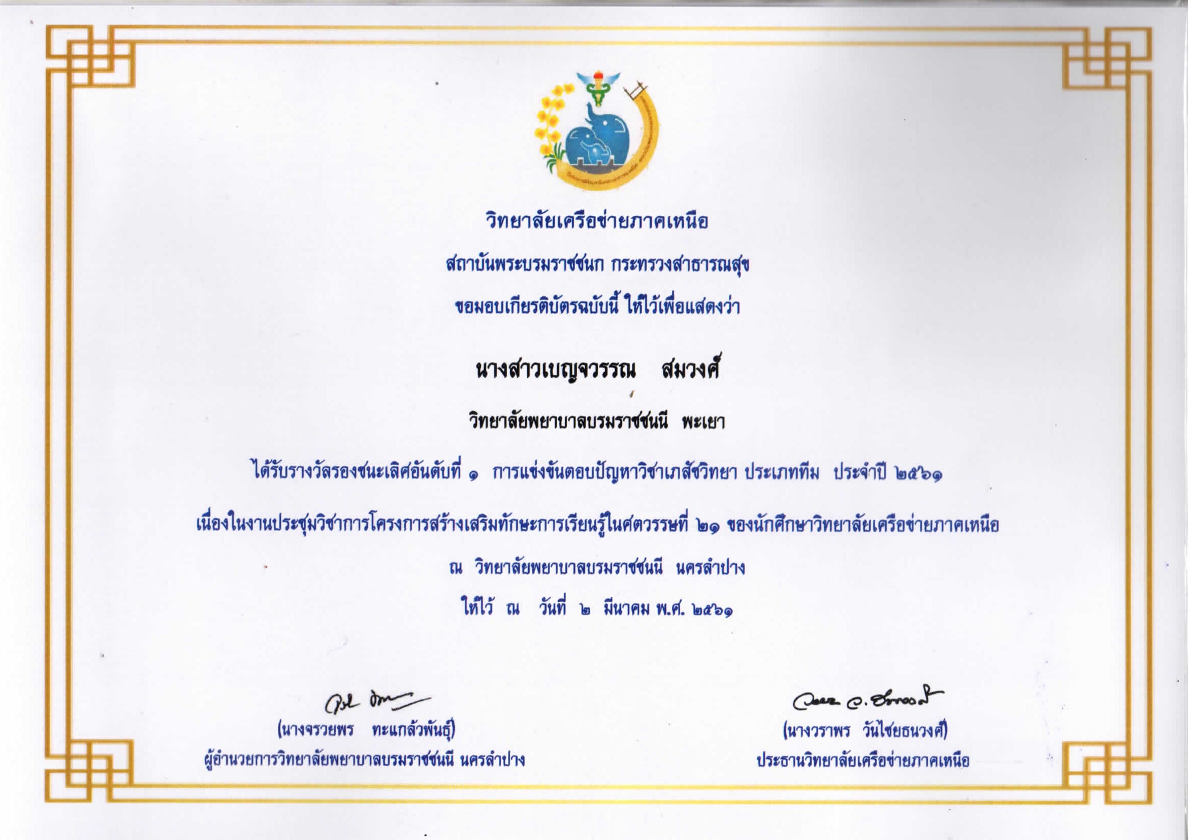 5.นางสาวเบญจวรรณ สมวงศ์ ได้รับรางวัลรองชนะเลิศอันดับ 1 การแข่งขันตอบปัญหาวิชาเภสัชวิทยา ประเภททีม ประจำปีการศึกษา 2561 ในงานประชุมวิชาการโครงการสร้างเสริมทักษะการเรียนรู้ในศตวรรษที่ 21 ของนักศึกษาวิทยาลัยเครือข่ายภาคเหนือ วันที่ 2 มีนาคม 2561
