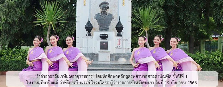 "รำอำลาอาลัยเกษียณอายุราชการ" โดยนักศึกษาหลักสูตรพยาบาลศาสตรบัณฑิต ชั้นปีที่ 1 ในงานมุทิตาจิตแด่ ว่าที่ร้อยตรี ณรงค์ โรจนโสธร ผู้ว่าราชการจังหวัดพะเยา วันที่ 19 กันยายน 2566