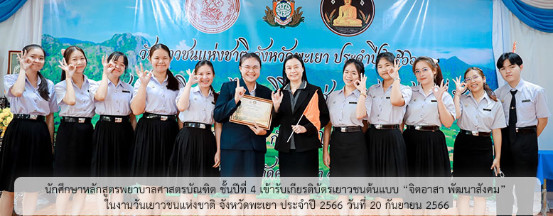 นักศึกษาหลักสูตรพยาบาลศาสตรบัณฑิต ชั้นปีที่ 4 เข้ารับเกียรติบัตรเยาวชนต้นแบบ “จิตอาสา พัฒนาสังคม” ในงานวันเยาวชนแห่งชาติ จังหวัดพะเยา ประจำปี 2566 วันที่ 20 กันยายน 2566